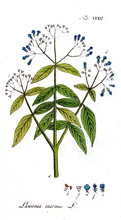 رنگ حنا که برای رنگ آمیزی پوست ، مو و ناخن ها و همچنین پارچه هایی از جمله ابریشم ، پشم و چرم استفاده می شود. خواص دارویی برای درمان سنگهای کلیوی ، زردی ، ترمیم زخم ؛ جلوگیری از التهاب پوست. پوست به طور سنتی در درمان زردی و بزرگ شدن طحال ، حساب کلیه ، جذام و بیماری های پوستی لجباز استفاده می شود. نام این گونه به نام پزشک اسکاتلندی ایزاک لاوسون ، دوست خوب لینه است.[2]