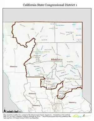 Wikipedia contributors, "California's 1st congressional district," Wikipedia, The Free Encyclopedia, http://en.wikipedia.org/w/index.php?title=California%27s_1st_congressional_district&redirect=no&useskin=monobook&oldid=562878830 (accessed July 12, 2013).