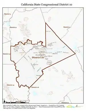 Wikipedia contributors, "California's 10th congressional district," Wikipedia, The Free Encyclopedia, http://en.wikipedia.org/w/index.php?title=California%27s_10th_congressional_district&redirect=no&useskin=monobook&oldid=556658633 (accessed July 12, 2013).