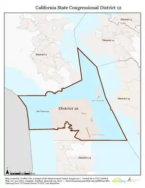 Wikipedia contributors, "California's 12th congressional district," Wikipedia, The Free Encyclopedia, http://en.wikipedia.org/w/index.php?title=California%27s_12th_congressional_district&redirect=no&useskin=monobook&oldid=561778199 (accessed July 12, 2013).