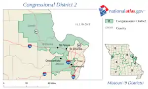 Wikipedia contributors, "Missouri's 2nd congressional district," Wikipedia, The Free Encyclopedia, http://en.wikipedia.org/w/index.php?title=Missouri%27s_2nd_congressional_district&redirect=no&useskin=monobook&oldid=544586815 (accessed July 12, 2013).