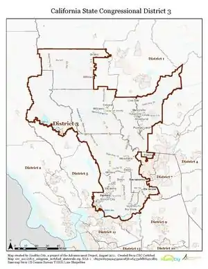 Wikipedia contributors, "California's 3rd congressional district," Wikipedia, The Free Encyclopedia, http://en.wikipedia.org/w/index.php?title=California%27s_3rd_congressional_district&redirect=no&useskin=monobook&oldid=562881970 (accessed July 12, 2013).
