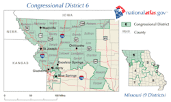Wikipedia contributors, "Missouri's 6th congressional district," Wikipedia, The Free Encyclopedia, http://en.wikipedia.org/w/index.php?title=Missouri%27s_6th_congressional_district&redirect=no&useskin=monobook&oldid=537566978 (accessed July 12, 2013).