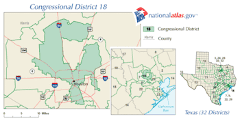 Wikipedia contributors, "Texas's 18th congressional district," Wikipedia, The Free Encyclopedia, http://en.wikipedia.org/w/index.php?title=Texas%27s_18th_congressional_district&redirect=no&useskin=monobook&oldid=531618986 (accessed July 12, 2013).