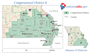 Wikipedia contributors, "Missouri's 8th congressional district," Wikipedia, The Free Encyclopedia, http://en.wikipedia.org/w/index.php?title=Missouri%27s_8th_congressional_district&redirect=no&useskin=monobook&oldid=562388028 (accessed July 12, 2013).