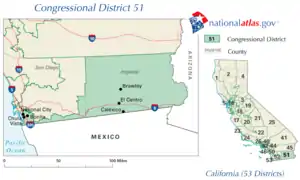 Wikipedia contributors, "California's 51st congressional district," Wikipedia, The Free Encyclopedia, http://en.wikipedia.org/w/index.php?title=California%27s_51st_congressional_district&redirect=no&useskin=monobook&oldid=562326753 (accessed July 12, 2013).