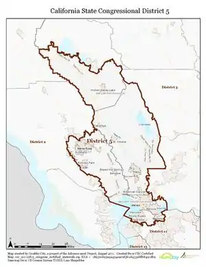 Wikipedia contributors, "California's 5th congressional district," Wikipedia, The Free Encyclopedia, http://en.wikipedia.org/w/index.php?title=California%27s_5th_congressional_district&redirect=no&useskin=monobook&oldid=559497175 (accessed July 12, 2013).