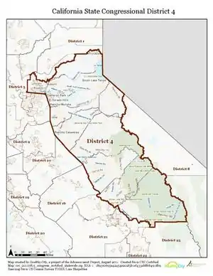 Wikipedia contributors, "California's 4th congressional district," Wikipedia, The Free Encyclopedia, http://en.wikipedia.org/w/index.php?title=California%27s_4th_congressional_district&redirect=no&useskin=monobook&oldid=561863462 (accessed July 12, 2013).