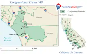 Wikipedia contributors, "California's 49th congressional district," Wikipedia, The Free Encyclopedia, http://en.wikipedia.org/w/index.php?title=California%27s_49th_congressional_district&redirect=no&useskin=monobook&oldid=562326517 (accessed July 12, 2013).