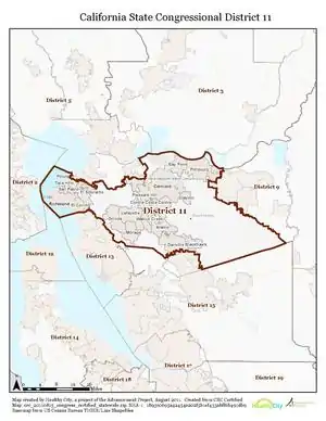 Wikipedia contributors, "California's 11th congressional district," Wikipedia, The Free Encyclopedia, http://en.wikipedia.org/w/index.php?title=California%27s_11th_congressional_district&redirect=no&useskin=monobook&oldid=554780589 (accessed July 12, 2013).