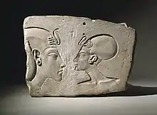 سمت چپ، سر شاه دیده میشود که به احتمال زیاد باید آخناتون باشد، او یک خات گشاد به همراه اورائوس بر سر دارد و روبروی او سر ملکه است که سرپوش و اورائوسی را دارد که معمولاً نفرتیتی بر سر میکرده، لوح گِلی مربوط به ۱۳۵۲ تا ۱۳۳۶ پیش از میلاد، موزه بروکلین