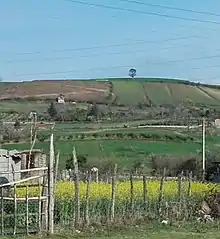 تپه ای با زمین های کشاورزی در خارکش به همراه تک درختی زیبا