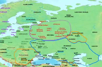 ![]() نقشه دهکدههای روس (قرمز) و قبایل اسلاو (خاکستری) طی اواسط قرن نهم میلادی. | |||||||