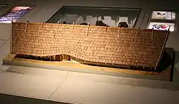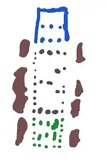 این الگوی تقسیم شدن در فضای بیرونی خانه نیز ادامه یافتهاست و به نظر میرسد آرایش گودالها خاکی متقارن یافتهشده در پهلوی خانهها با تقسیمبندی داخلی خانه شکل گرفته باشد.[33] این گودالهای خاکی احتمالاً جهت تأمین مصالح مورد نیاز برای گلاندود کردن دیوارها کنده شدهاند.[34] گاه این گودالها در تمام طول نمای خانه قرار داشتهاند و گاه با گذرگاههایی منقطع شدهاند.[35] به باور باستانشناس فرانسوی دانیل سیمونین[persian-alpha 3] این گودالها بازتاب جایگاه پنجرههای حفرهای در نمای خانه بودهاند،[36] ولی ریچارد بردلی تفسیرهای صرفاً کارکردی را ناکافی میداند و میگوید این گودالها با تدفین کودکان مرتبط بودهاند.[37] دفن بزرگسالان در مقبرههایی با فاصله از سکونتگاه صورت میگرفتهاست[38] و در آنها جهتگیری پیکر مرده عمود بر محور خانه بودهاست.[39]