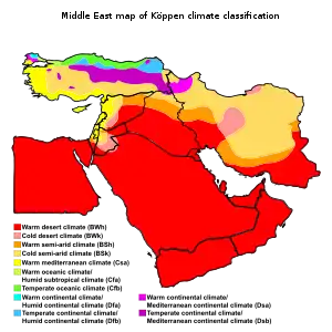 اکثر مناطق خاورمیانه دارای اقلیمی گرم و خشک و مناطق بایر است. اما وجود چند رود بزرگ و مهم از جمله رودهای نیل، دجله، فرات و کارون به کشاورزی و آبادانی و تمدن در این منطقه کمک کردهاست.[4] خاورمیانه دارای تاریخی کهن و غنی است و این منطقه از نخستین سکونتگاههای بشر است. تاریخ خاورمیانه دارای ارزش و اهمیت ژئوپولیتیکی بالاست و آغاز آن به دوران باستان بازمیگردد.[1]