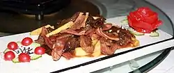 در شرق آسیا از گوشت، پوست و تقریباً تمام اعضای خر در آشپزی استفاده میشود.[13] یک ضربالمثل قدیمی چینی میگوید: «خوراک اژدها در آسمان (بهشت) و خوراک خر روی زمین».[13] از آلت تناسلی این حیوان در طبخ غذا استفاده میشود و برخی رستورانها چون رستورانهای گوا لی ژوانگ (en) به عرضهٔ این غذا میپردازند.[14][15] رستورانهای گوا لی ژوانگ متخصص در ارائه خوراک از آلات تناسلی و دنبلان) گونههای مختلف حیوانات است.[14][نکته 1] چینیها معتقدند که خوردن آلت نری میتواند قوای جنسی را تقویت کند.[14]