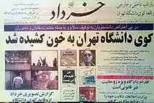![]() تصویر صفحه اول روزنامه خرداد درباره حمله به کوی دانشگاه تهران (۱۸ تیر ۱۳۷۸) | |