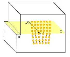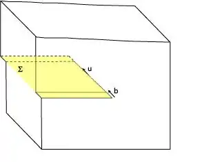 که تنش اعمال شده، بردار برگرز، و مساحت صفحهٔ لغزش است.