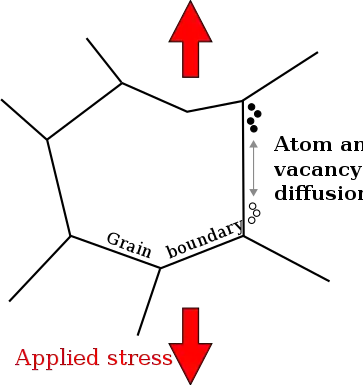 ما با فرض یک دانه کروی ادامه می دهیم تا با مشتق خزش Nabarro-Herring سازگار باشیم؛ با این حال ، ثابت های هندسی را به یک ثابت تناسب جذب خواهیم کرد اگر غلظت جای خالی دانه را تحت تنش کششی اعمال شده در نظر بگیریم ، توجه خواهیم کرد که غلظت خالی بیشتری در خط استوا (عمود بر تنش اعمال شده) نسبت به قطب ها وجود دارد (به موازات تنش اعمال شده).