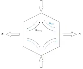 این را می توان با اشاره به مشاهده کرد و در نظر گرفتن یک انبساط دمای بالا ، جایی که اولین اصطلاح در سمت راست غلظت جای خالی ناشی از تنش کششی و ترم دوم غلظت ناشی از تنش فشاری است. این تغییر غلظت عمود بر محور تنش اعمال شده رخ می دهد ، در حالی که به موازات تنش تغییری در غلظت جای خالی ایجاد نمی شود ( به دلیل اینکه استرس برطرف شده و کار صفر است).