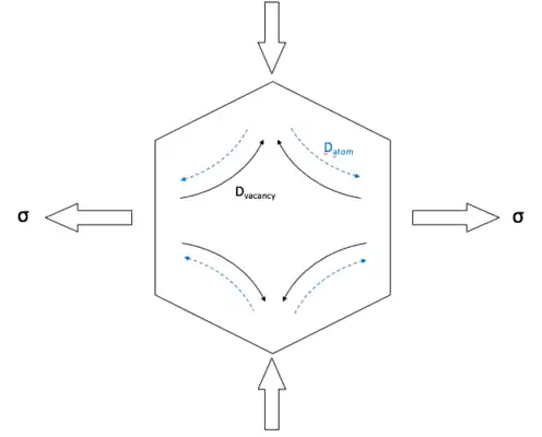خارج شدن اتمها از مناطقی که تحت فشار هستند و قرارگیری آنها در مناطقی که تحت کشش میباشند، انرژی آزاد اتمها را تقریباً به مقدار ۲Ωσ میکاهد بطوریکه در آن σ تنش اعمالی و Ω حجم اتمی میباشد. این کاهش انرژی نیروی محرکه خزش در ماده میباشد.[3]
