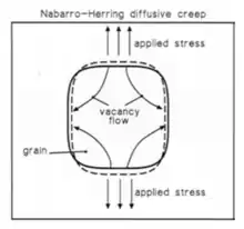 همانگونه در شکل بالا نیز مشاهده میشود، جاهای خالی از مرزهای دانهای که عمود بر جهت اعمال نیروی کششی هستند، به سمت مرزهای دانهای که موازی با جهت اعمال نیروی کششی هستند حرکت میکنند[9] شار نفوذی بین مرزهای موازی و عمود بر محور تنش متناسب با میزان تنش و ضریب نفوذ شبکه DL بوده و با فاصله نفوذ بین منبع حرکت اتمها و مقصد آنها نسبت عکس خواهد داشت. سرعت خزش در فرایند نابارو- هرینگ (H-N)با رابطه زیر بدست خواهد آمد: