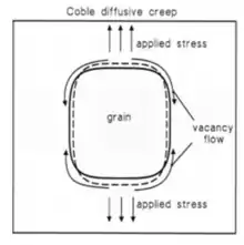 این مکانیزم شامل حرکت جاهای خالی تحت تنش اعمالی در سرتاسر بلور است و معمولاً در سطوح تنشی پایین رخ میدهد.[7] در حالتی که جسم تحت تأثیر تنش باشد، قسمتهایی از جسم در حال کشیده تر شدن و قسمتهایی دیگر در حال فشرده شدن هستند. تنش اعمالی در یک ماده کریستالی موجب افزایش چگالی جاهای خالی در مرزدانههای تحت کشش میشود و متناظر با آن در مرزدانههایی که تحت تنش فشاری قرار دارند، چگالی جاهای خالی کاهش مییابد.[8] جاهای خالی از مرزهای فشاری به مرزهای کششی تغییر مکان میدهند که این فرایند با نفوذ کنترل میشود. رخ دادان حرکت جاهای خالی و یا اتمهای بیننشین به وسیلهٔ نفوذ در شبکه و یا مرزهای دانه منجر به خزش پلی کریستال میشود. بسته به اینکه این نابجاییها از کدام مسیر عبور کنند این مکانیزم به دو نوع خزش نابارو - هرینگ (Nabarro - Herring cree) و خزش کوبل (Coble creep)تقسیم میشود. این دو مسیر سیلان[نفوذ در شبکه و مرزدانه] هر یک به صورت مستقل در نرخ کرنش سهیم خواهند بود و موجب افزایش خطی نرخ کرنش با تنش میشوند. برای این دو مسیر نفوذ رابطه تلفیقی زیر، نشان دهنده ارتباط بین نرخ کرنش کششی و تنش کششی خواهد بود: