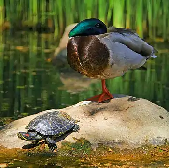 | لاکپشت گوشقرمز و اردک سرسبز دو گونه از خزندهچهرگان | |