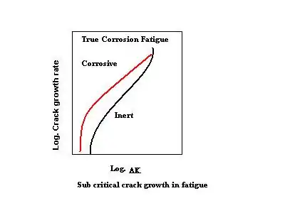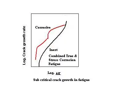 رشد ترک اضافی (خط قرمز) بالاتر از شدت تنش آستانه برای ترک خوردگی تنشی، ناشی از SCC رخ میدهد . نواحی با شدت تنش کمتر تحتتاثیر قرار نمیگیرند و دامنه شدت تنش آستانه برای گسترش ترک خستگی در محیط خورنده بدون تغییر باقی میماند. در حالت کلی، رشد ترک خستگی خوردگی میتواند هر دو اثر بالا را نشان دهد. رفتار رشد ترک در طرح کلی زیر نشانداده شدهاست.[9]