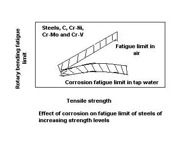 برای بررسی نیازمندی های تکنولوژی جدید مواد با استحکام بالا به وسیله عملیات حرارتی و آلیاژسازی توسعه پیدا کرده اند. می توان گفت که مواد با استحکام بالاتر حد خستگی آن ها بالاتر است . گرچه حضور قطعات در محیط های خورنده در حین تنش خستگی این مزیت را می تواند از بین ببرد در حالیکه حد خستگی معمولاً به سطوح تنشی برای یک سری از آلیاژها حساس نیست. این اثر به صورت شماتیکی برای فولادهای مختلف در شکل زیر نشان داده شده است که اثر تضعیف کننده محیط خورنده را نشان می دهد.[7]