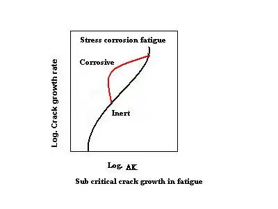 که Δkth محدوده ضریب شدت تنش آستانه می باشد و در محیط خورنده تقریباً برابر صفر است . در واقع براثر تجزیه آندی، هیچ حد پایینی برای خوردگی وجود ندارد .[6]