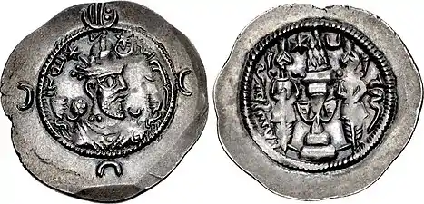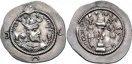 نفیسی، تاریخ تمدن ایران ساسانی، ۴۸. - سرفراز، سکههای ایران از آغاز تا دوران زندیه، ۹۳.
