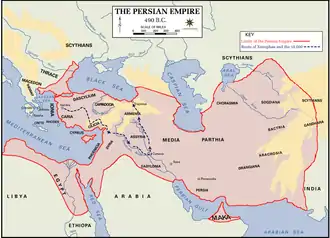 تمیستوکلس پیروز آتنی نبرد سالامیس، پس از رانده شدن از آتن به دربار ایران در شوش پناه برد و شاید نخستین نامآور باختریست که در دربار ایران میتوانست با زبان ایرانی سخن بگوید.[43]