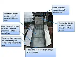 - مشارکتکنندگان ویکیپدیا. «Solar dryer». در دانشنامهٔ ویکیپدیای انگلیسی، بازبینیشده در ۲۸ آوریل ۲۰۲۱.