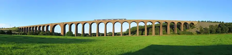 Panoramic view of the Highland Line Culloden Viaduct with a First ScotRail train on it