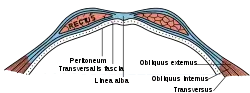 ![]() برش عرضی غلاف ماهیچه راست شکم، خط سفید در وسط تصویر قرار دارد | |