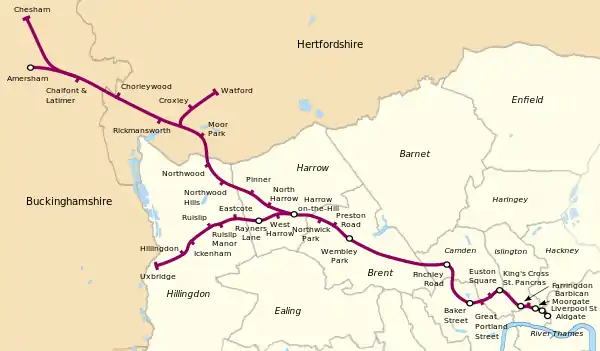 | ایستگاه متروی مور پارک | ![]() | ۹ مه ۱۹۱۰ | Main line | Originally Sandy Lodge, renamed Moor Park & Sandy Lodge 18 October 1923, Moor Park ۲۵ سپتامبر ۱۹۵۰ | ۵۱°۳۷′۴۷″ شمالی ۰۰۰°۲۵′۵۸″ غربی |