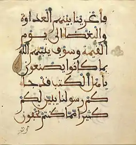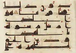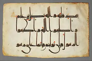قرآن به خط کوفی که زرنویسی شدهاست.