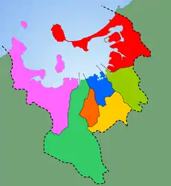 شهر فوکوئوکا در کنارهٔ خلیج هاکاتا رنگها نشاندهنده بخش های مختلف این شهر هستند.