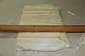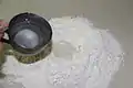 ۲. بهطورکلی در پاشیدن آرد به سطح زیر خمیر باید کمترین میزان را در نظر گرفت و در هنگام تا کردن نیز با برس آشپزی آرد اضافه را از روی خمیر زدود.[56]