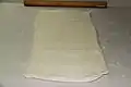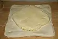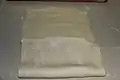 - بار اول تا زدن ، خمیر با وردنه باز شده تا حدی که طول آن به اندازه سه برابر مربع میانی شود.[41] خمیر باز شده معمولاً ابعادی بین ۶۰ ✕ ۲۵ – ۴۰ ✕۲۰ سانتیمتر دارد. این خمیر با ابعاد ذکرشده، ضخامتی تقریبی در حدود یک سانتیمتر را دارد. خمیر یکبار به صورت سه لا تا زده شده و پس از تا زدن ۹۰ درجه چرخیده و عمل باز کردن و تا کردن تکرار میشود. خمیر تا زمان سفت شدن مجدد کره داخل آن، در داخل نایلون قرار گرفته و در داخل یخچال خوابانده میشود. مدت زمان خواباندن خمیر پس از هر بار تا زدن در منابع گوناگون متفاوت است و زمان ۲۰–۱۵ دقیقه[42] ۳۰ دقیقه[43] ۱ ساعت،[44][45][46] ۲–۱ ساعت[47] و ۳–۲ ساعت[48] ذکر شدهاست.