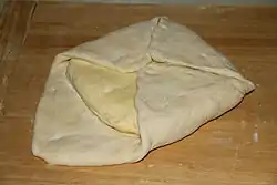 سفتی کره با سفتی خمیرآب یکسان باید باشد. کره وسط خمیرآب طوری قرار میگیرد که گوشههای کره مماس با وسط اضلاع خمیرآب باشد و با اضلاع آن زاویهٔ ۴۵ درجه تشکیل دهد. سپس خمیرآب بر روی کره کشیده شده به صورت پاکت درآورده میشود. مابین خمیرآب و کره نباید هوا باقی بماند.[40]