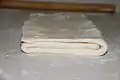 - بار سوم تا زدن ، تا زدن مشابه قبل انجام شده و خمیر در یخچال خوابانده میشود. بدین ترتیب خمیر سه نوبت یا شش بار، باز و بسته شده و آماده است.[49]