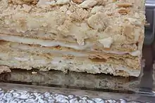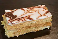 شیرینی ناپلئونی یا میلفوی | در زبان فرانسوی به معنای هزار برگ، نوعی پای یا شیرینی سه لایه با منشأ فرانسوی است. بهطور سنتی در میان لایههای این خمیر کرم کاستارد قرار دارد و سطح بالایی آن با پودر قند پوشانده میشود همچنین ممکن است به جای کرم کاستارد خامه زده شده یا مربا یا دیگر مواد نیز استفاده شود.[73] |