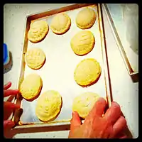 ۳. خمیرآب گرد شده و روی آن با کارد به شکل یک ضربدر بریده میشود.