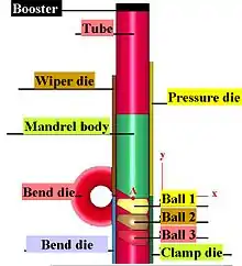 خم شدن لوله به عنوان یک فرایند با بارگذاری یک لوله به یک لوله یا لوله خم کن و آن را در جایگاه بین دو میله شروع میشود، بلوک محکم و خمیر قالب قرار میدهد. لوله نیز به دو صورت دیگر آزاد میشود، خمیر کاغذ میچسبد و فشار میمیرند. فرایند خمش لوله شامل استفاده از نیروی مکانیکی است تا لوله یا تیوب را در مقابل یک ماده فشار قرار داده و لوله یا لوله را به شکل قالب متصل سازد. اغلب، لولههای قنداق بهطور محکم در محل نگهداری میشوند، در حالی که انتهای آن در اطراف میله چرخانده شده و رول میشود. دیگر اشکال پردازش شامل فشار دادن سهام از طریق غلطکها که آن را به یک منحنی ساده خم میکند.[3] برای برخی از پردازش خم شدن لوله، یک سنبه داخل لوله قرار داده شده تا از فروپاشی جلوگیری شود. این لوله در فشار کشیدن توسط یک ماده پاککننده ای نگهداری میشود تا از بروز هرگونه خارش در طول استرس جلوگیری شود. یک ماده خمیرکننده معمولاً از یک آلیاژ نرمتر مانند آلومینیوم یا برنج ساخته شدهاست تا از خراش دادن یا آسیب رساندن خم شدن مواد جلوگیری شود. بخش عمده ای از ابزار ساخته شده از فولاد سخت یا فولاد ابزار برای حفظ و طول عمر ابزار است. با این حال، هنگامی که نگرانی از خراش دادن یا خرد شدن قطعه کار وجود دارد، مواد نرمتر مانند آلومینیوم یا برنز استفاده میشود. به عنوان مثال، بلوک بست، بلوک شکل چرخشی و فشار فشار اغلب از فولاد سخت تشکیل شدهاست، زیرا لوله در حال حرکت از این قطعات ماشین است. مرگ و میر با فشار دادن از آلومینیوم یا برنز تشکیل میشود تا شکل و سطح قطعه کار را حفظ کند. دستگاههای خمش لوله معمولاً نیروی انفجاری، پنوماتیک، هیدرولیکی، هیدرولیکی یا موتور سروو موتور هستند.