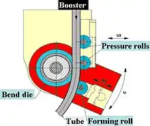 روند خمش سه رول خمش سه رول (TRPB) فرایند خمش آزاد است که اغلب برای ساخت هندسه خمشی از چندین خم شدن هواپیما استفاده میشود. با این وجود، شکلدادن به 3D امکانپذیر است. پروفیل در بین رول خمش و پشتیبانی رول(ها) هدایت میشود، در حالی که از طریق ابزارها تحت فشار قرار میگیرد. موقعیت شکلگیری رول شعاع خمش را مشخص میکند. نقطه خمش نقطه نقطه مماس بین لوله و خمش رول است. برای تغییر هواپیما خمشی، فشار دادن لوله در اطراف محور طولی آن را میچرخاند. بهطور کلی، یک کیت ابزار TRPB را میتوان بر روی یک دستگاه خم کن معمولی دوار استفاده میشود. فرایند بسیار انعطافپذیر است زیرا با یک مجموعه ابزار منحصر به فرد، چندین مقدار شعاع خمش Rm میتواند به دست آید،[5] اگرچه دقت هندسی این فرایند با خم شدن چرخش چرخشی قابل مقایسه نیست. خطوط خمشی تعریف شده به عنوان عملکرد اسپینین یا چندجمله ای میتوانند تولید شوند.[6]