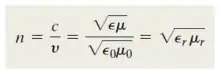 که در آن اپسیلون آر و میو آر به ترتیب ثابت. دی الکتریک و تراوایی مغناطیسی نسبی هستند. چون بیشتر مواد تنها به میزان اندکی مغناطیسی هستند