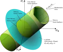 که در آن σ1 ماکسیمم تنش عمودی σ3مینیمم تنش عمودی و σ0 تنشی است که مواد تحت نیروی چند محوری میشکنند. یک سطح تسلیمی ممکن است ایجاد شود که نمایانگر این فرض میباشد. داخل این سطح تسلیم تغییر شکل الاستیک است و روی این سطح تغییر شکل پلاستیک است و در خارج این سطح تسلیم شرایط تنشی وجود ندارد.