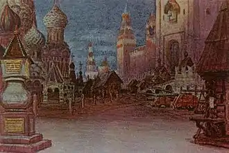![]() صحنه طراحی شده توسط آپولیناری واسنِتسوف برای اپرای خصوصی روسی، موسکو ۱۸۹۷، میدان سرخ | |